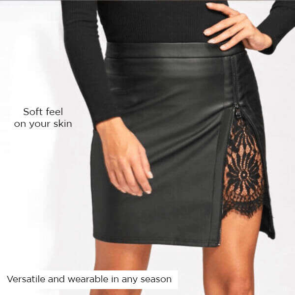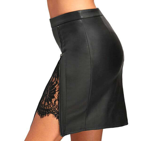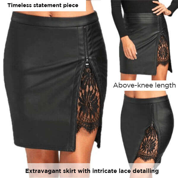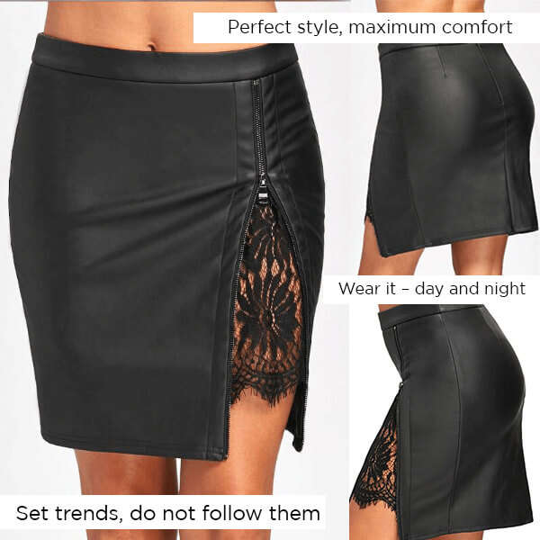 Opis proizvoda: Maite je moderna suknja s čipkastim detaljima na prorezu. Prikladna je za svakodnevno nošenje, ali i za svečane prigode, jer se lako kombinira s drugim komadima odjeće. Udobna je i rastezljiva. Prorez ima patentni zatvarač. Duljina suknje je iznad koljena.