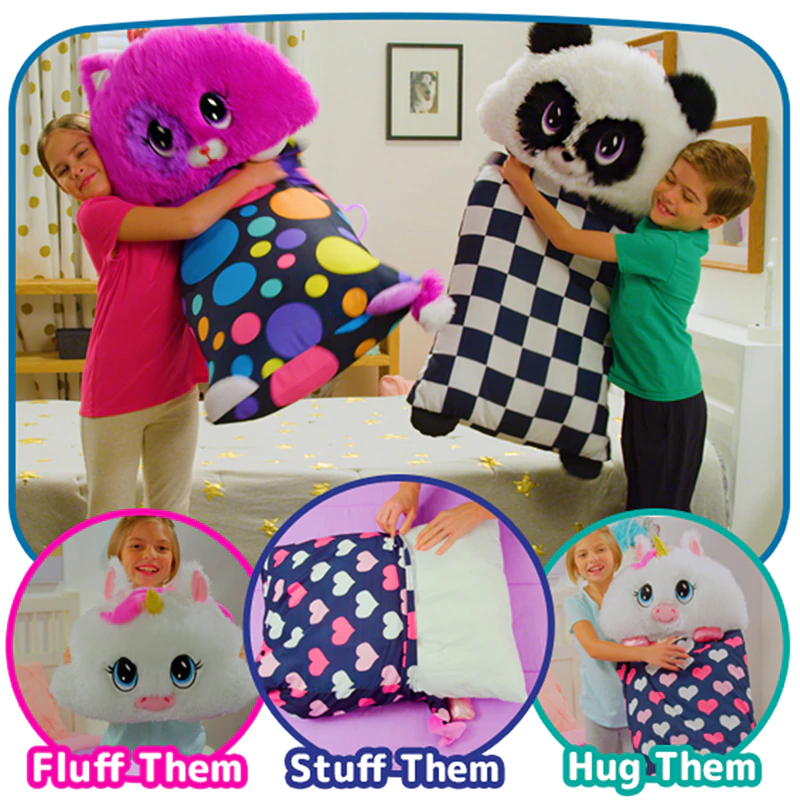 Fluff Pets sunt fetele de perna care in acelasi timp sunt si o companie pufoasa! Partea superioara, jucaria de plus, se poate atasa sau detasa de la fata de perna dupa bunul plac.