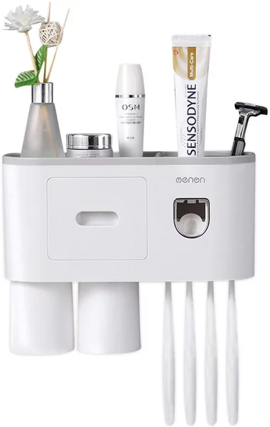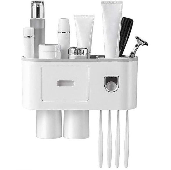 Organizator držač četkica za zube, s dozatorom paste, magnetne čašice, ladica, bijela