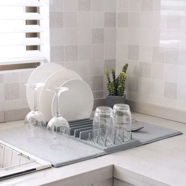 Ovaj kompaktni i učinkoviti stalak za sušenje posuđa ima 11 pozicija za tanjure različitih veličina i prostor za čaše i pribor za jelo. Krpa od pjene, koja je uključena u set, je sklopiva i periva, što olakšava skladištenje i održavanje čistoće u kuhinji.
