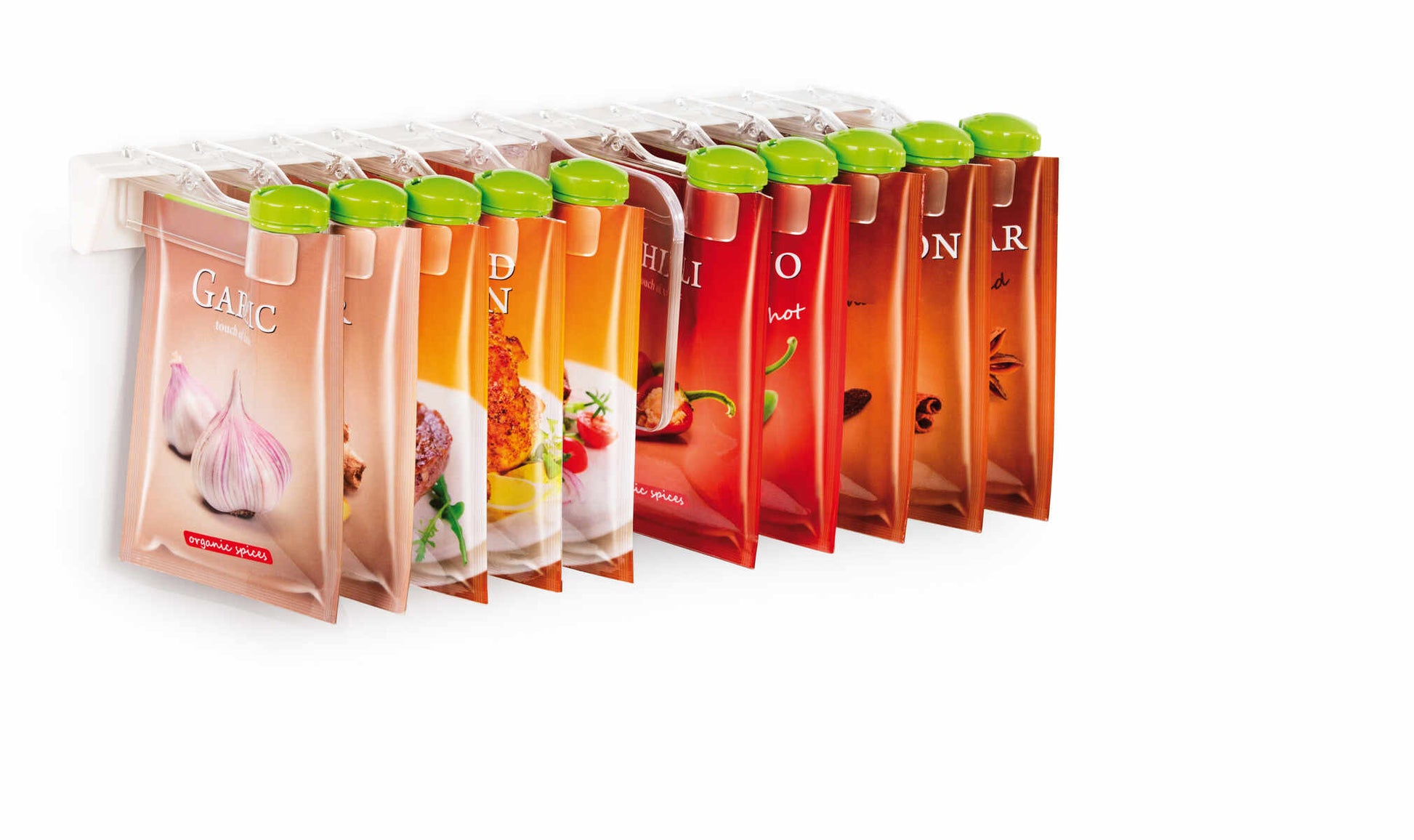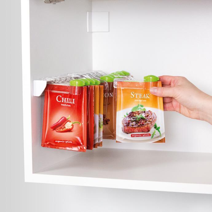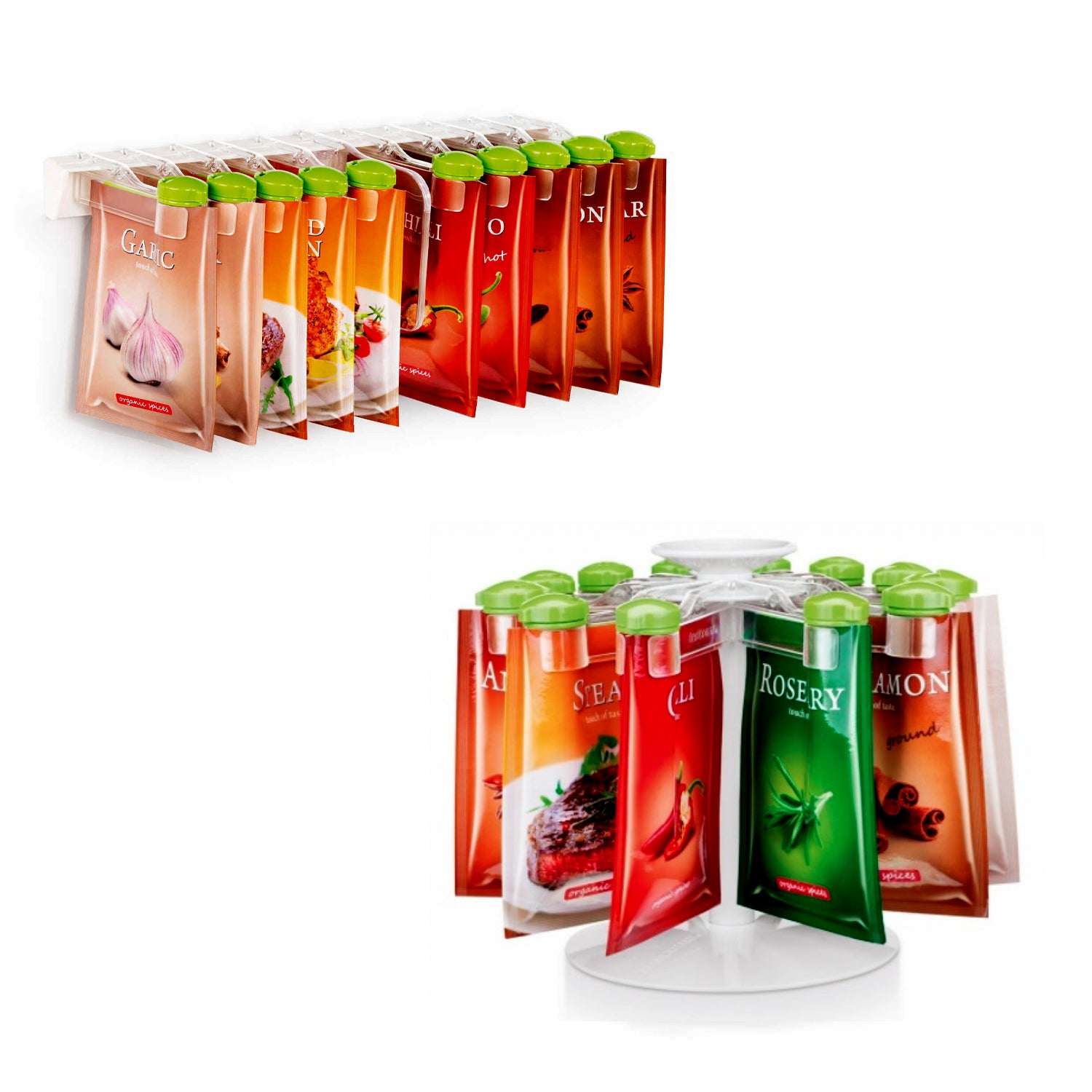 Stezaljke s rupama izvrsne su za začinjanje hrane izravno iz vrećice i za brtvljenje vrećice za pohranu. Vrećice sa začinima mogu se pojedinačno uzimati s nosača ili se svih 12 vrećica s nosačem mogu pomicati zajedno. Prednost je što ovi začini u ziplock vrećicama ostaju suhi i skladištenjem ne gube okus.