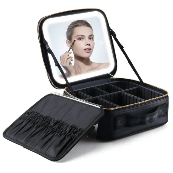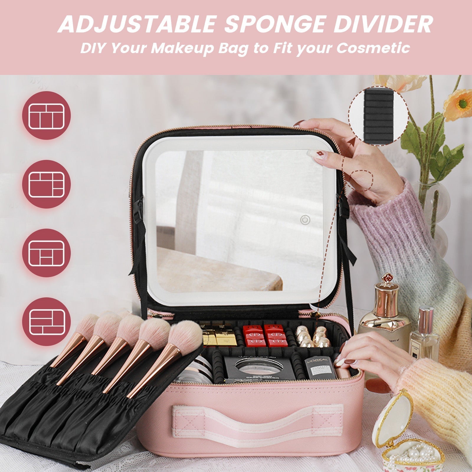Torba za Make-up s LED Ogledalom, Podesivi Razdjeljivači - Organizator za Kozmetiku i Nakit 29 cm, Roza (Mala)